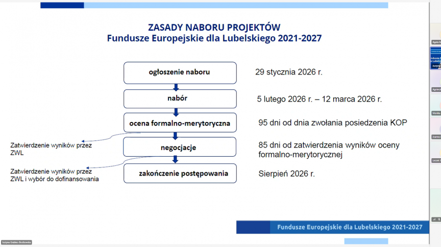 Departament Wdrażania Europejskiego Funduszu Społecznego (DW EFS) Urzędu Marszałkowskiego Województwa Lubelskiego w Lublinie, zorganizował w dniu 25.02.2026 r. Webinarium pn. „Aplikowanie o środki na dofinansowanie projektu w ramach naboru nr FELU.10.07-IZ.00-001/26 - Budowanie potencjału organizacji społeczeństwa obywatelskiego w obszarze edukacji”.