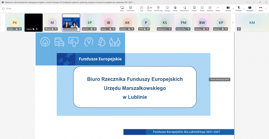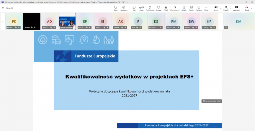 Departament Wdrażania Europejskiego Funduszu Społecznego (DW EFS) Urzędu Marszałkowskiego Województwa Lubelskiego w Lublinie, zorganizował w dniu 07.10.2025 r. webinarium dla beneficjentów realizujących projekty w ramach Priorytetu VIII Zwiększanie spójności społecznej, programu Fundusze Europejskie dla Lubelskiego 2021-2027 - trudności w realizacji i rozliczaniu projektów.