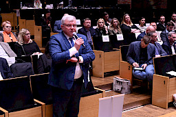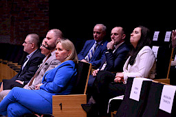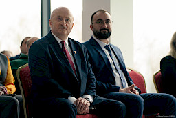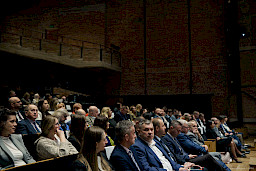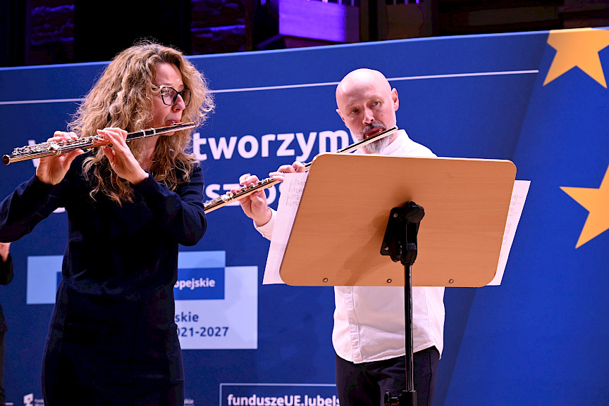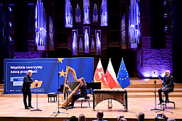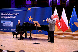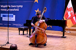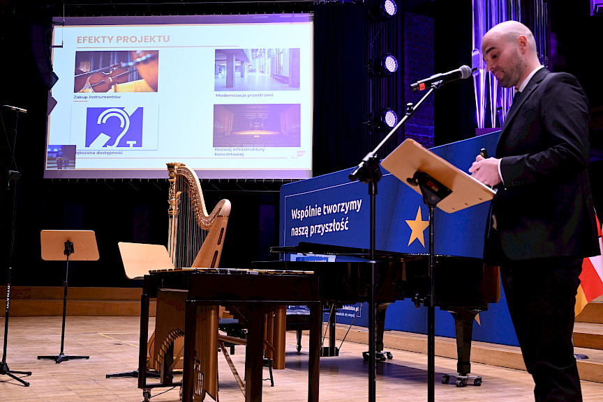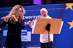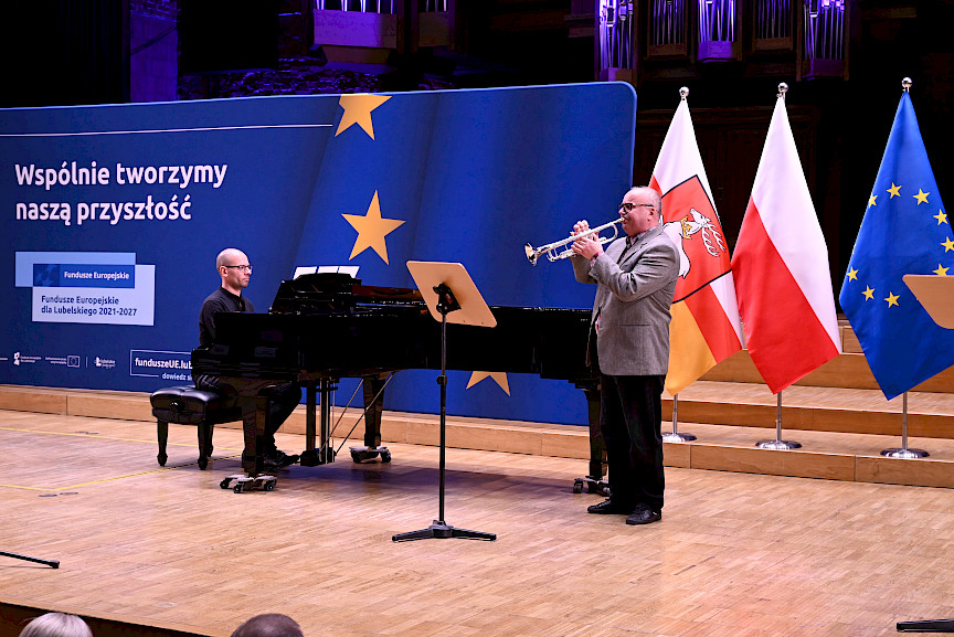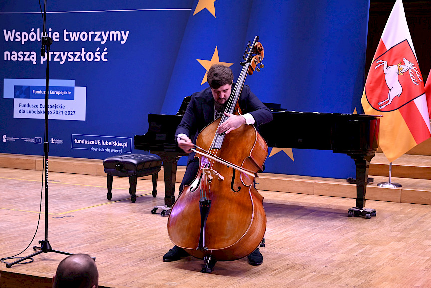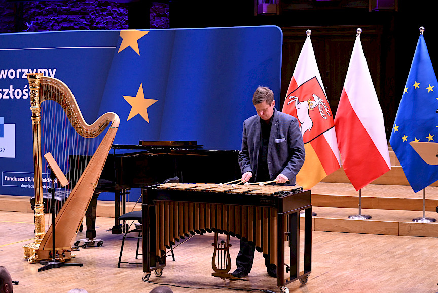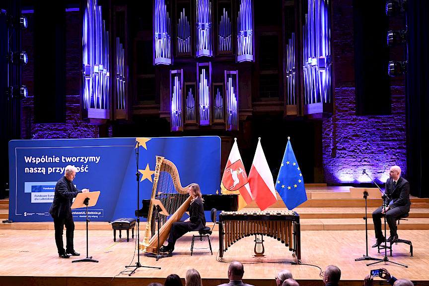 Po obradach Członkowie KM FEL udali się na wizytę studyjną dotyczącą projektu pt. Rozwój dziedzictwa kulturowego –”Kultura dźwięku”. Zwiększenie atrakcyjności i dostępności Filharmonii Lubelskiej, zrealizowanego przez Filharmonię w ramach Działania 7.9 FEL. Projekt ten, opiewający na 6,5 mln zł, z czego dofinansowanie z Funduszy Europejskich to niemal 5,5 mln zł, był realizowany od listopada 2023 r. do końca 2025 r. W ramach projektu wyremontowano foyer Filharmonii, zakupiono instrumenty i akcesoria muzyczne do prowadzenia działalności kulturalnej oraz odświeżono i doposażono Salę Koncertową. Efekty tych działań, z których skorzysta prawie 27 tys. osób rocznie, były w tym dniu udziałem Członków KM FEL, którzy zwiedzili obiekt, obejrzeli zakupione wyposażenie, a następnie wysłuchali mini koncertu w wykonaniu lubelskich filharmoników, którzy zagrali na instrumentach zakupionych z Funduszy Europejskich.
